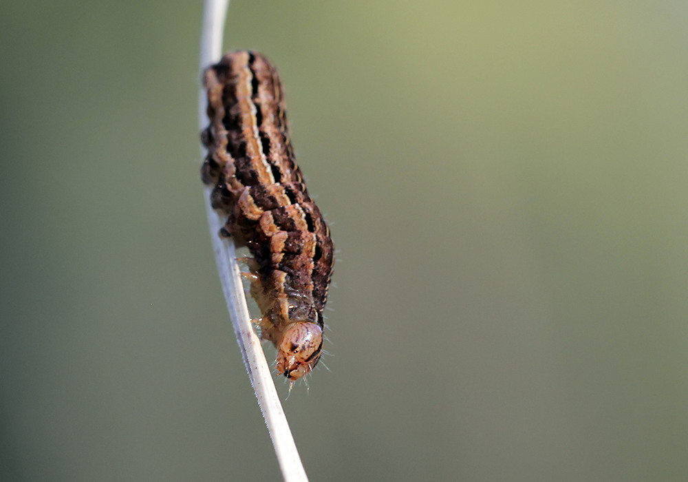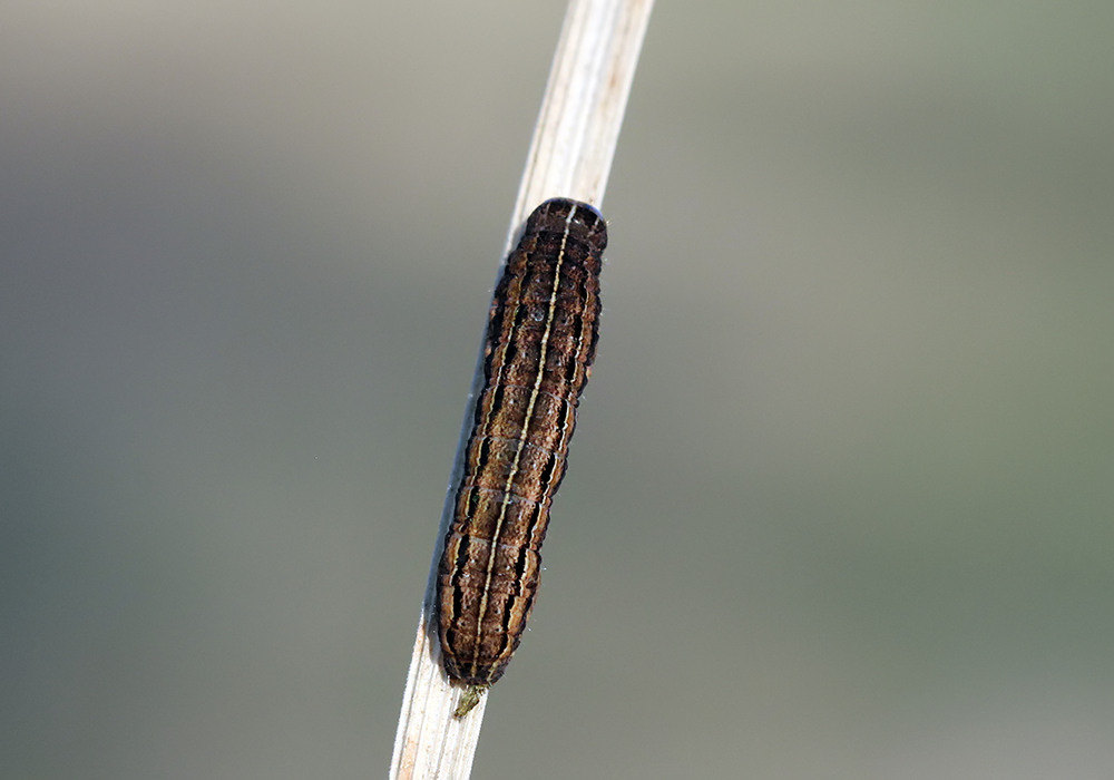 Kehitysvaiheet: Toukka ruskea, tummempinoroinen; selkäjuova okranvalkeahko, tummanruskeareunainen; sivuselkäjuova okranvalkeahko, sen yläpuolella takaruumiin jaokkeissa rivi mustahkoja juomuja, jotka ovat häipyviä keskiruumiin jaokkeissa; hengitysaukkojen yläpuolinen alue tummanruskea, alapuolinen vaaleanokra. Pää vaaleanruskea, tummempikuvioinen. Moniruokainen toukka elää syyskuusta toukokuuhun heinäkasveilla (Poaceae), mutta harvoin myös ruohoilla ja pensailla, esim. mataroilla (Galium). Laji talvehtii keskenkasvuisena toukkana ja koteloituu kevyeeseen kotelokoppaan maahan.