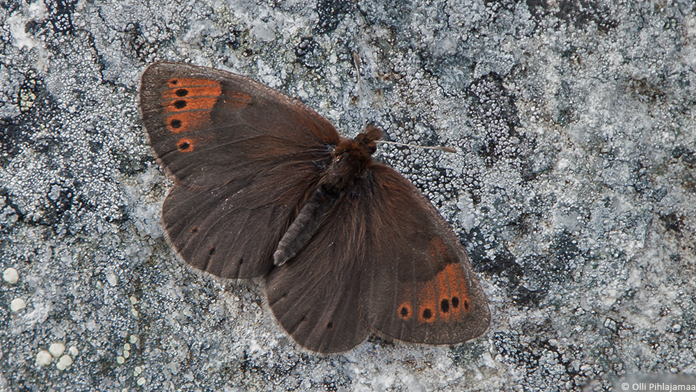 Siipien yläpinnan pohjaväri on koirailla tummanruskea ja naarailla hieman vaaleampi. Etusiiven etukulmassa on oranssinruskea vyö ja sen sisäreunassa on usein kapea tumma juova. Oranssinruskean alueen keskellä on koirailla mustia silmätäpliä ilman valkoista keskustaa. Takasiiven yläpuolella koirailla on yleensä muutama musta täplä, mutta täplät saattavat myös puuttua kokonaan. Naarailla etusiiven yläpuolen täplät puuttuvat joskus ja takasiiven yläpuolelta ne puuttuvat yleisesti.
