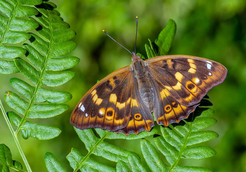 Siipien alapuoli on vaaleanruskea, ja silmätäplät näkyvät myös alapuolella sekä etu- että takasiivessä. Etusiivessä on suuri oranssikehäinen täplä, jonka keskus on tummansininen. Takasiiven takanurkassa on pienempi silmätäplä. Takasiiven poikki kulkee vaalea vyö, jossa on hieman vaaleanpunaista tai kellertävää. Etusiiven kärjessä ja takasiiven vaalean vyön reunoilla on tiilenpunaista.