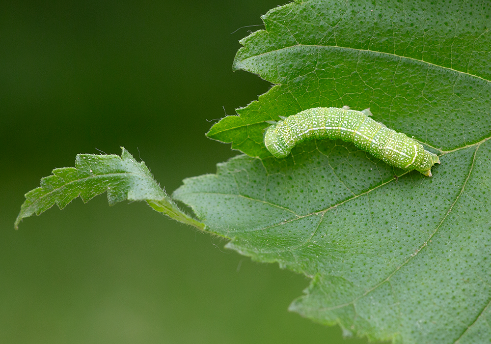 Kehitysvaiheet: Toukka on vihreä, tiheään kellertävänvalkotäpläinen; selkä-, sivuselkä- ja sivujuova kellertävänvalkeat, joskus hyvin epäselvät; prothoraxin etureunassa sekä jaokkeen A8 takareunassa leveä, kellertävänvalkea poikkijuova. Pää vihreä. – Toukka elää toukokuusta heinäkuuhun etupäässä tammella (Quercus), mutta myös muilla lehtipuilla, kuten lehmuksella (Tilia) ja pajuilla (Salix), yhteenkehräämiensä lehtien välissä. Toukka koteloituu kotelokoppaan maahan. Laji talvehtii kotelona, jonka sisällä on täysin kehittynyt aikuinen perhonen (ns. koteloimago).