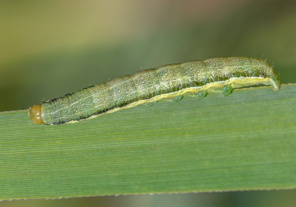 Kehitysvaiheet: Toukka on vihreä ja vaaleankellertävätäpläinen; selkä- ja sivuselkäjuova ovat vaaleankellertävät tai valkeahkot; sivujuova leveä, valkeahko, ylhäältä tummareunainen. Toiseksi viimeinen hengitysaukko sijaitsee selvästi sivujuovan yläreunassa. Pää vihreä. – Moniruokainen toukka elää toukokuusta heinäkuuhun mm. koivulla (Betula), tammella (Quercus), pajuilla (Salix), tuomella (Prunus padus), vadelmalla (Rubus idaeus), hierakoilla (Rumex) ja nokkosella (Urtica). Toukka koteloituu kotelokoppaan maahan. Laji talvehtii kotelona, jonka sisällä on täysin kehittynyt aikuinen perhonen (ns. koteloimago).